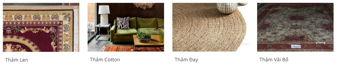 - Thảm cotton: Những tấm thảm làm từ chất liệu thiên nhiên rất lý tưởng cho cuộc sống hiện đại, bổ sung và làm đẹp cho bất cứ kiểu trang trí nội thất nào. Thảm cotton chuẩn không làm từ các hoá chất nhân tạo (keo, phẩm màu) nên không tạo mùi, không gây hại cho môi trường và sức khoẻ. Ngoài ra chúng khá bền bỉ, giảm tiếng ồn và cách âm tốt.